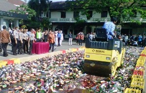 Bekasi – Pagi tadi Polresta Bekasi Kota memusnahkan enam belas ribu botol minuman keras (miras) beralkohol berbagai merek dan miras oplosan yang merupakan hasil Operasi Cipta Kondisi dalam rangka 100 hari kerja Kapolri dan menyambut masuknya bulan Ramadhan 2015di halaman Mapolresta Bekasi Kota, Rabu (17/6).