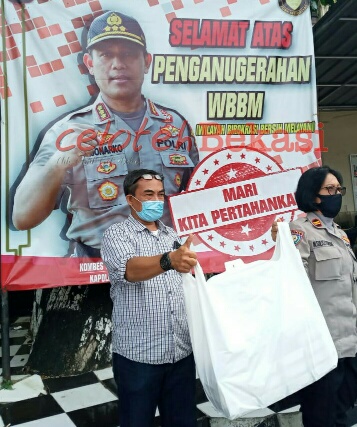 Bekasi – Sat Binmas Polres Metro Bekasi berikan 500 paket nasi bungkus dihalaman Polres Metro Bekasi Kota guna membantu kebutuhan pangan warga yang selama ini aktivitas usahanya terganggu dampak darurat penyebaran wabah Covid-19.