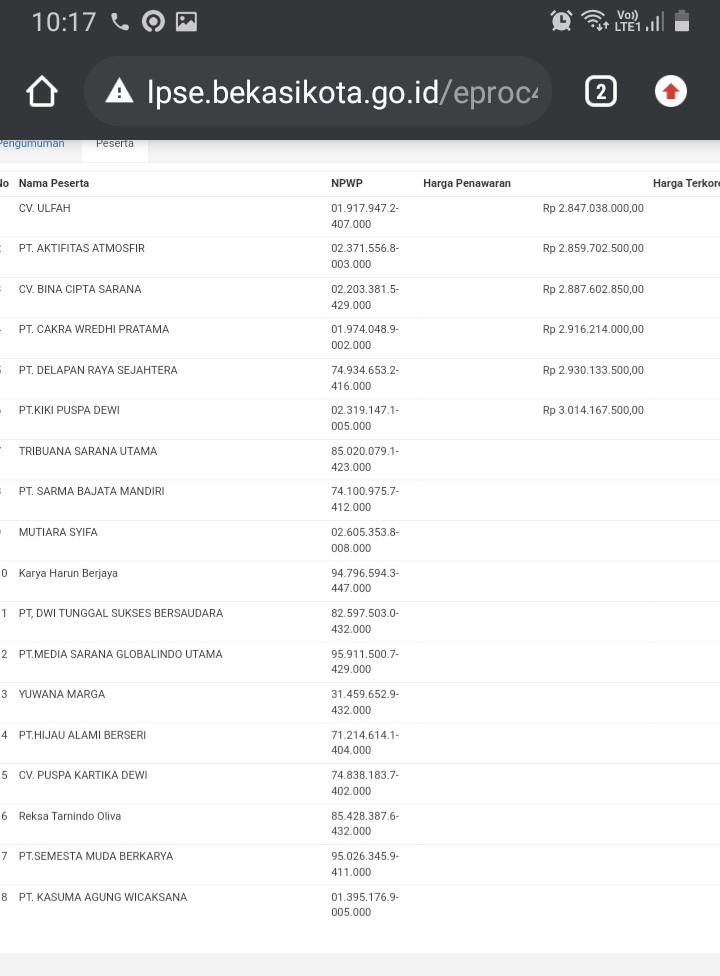 Bekasi– Sebanyak 18 perusahaan terdaftar di LPSE sebagai peserta lelang proyek Makan Minum (Mamin) senilai Rp 3,2 miliar. Tercatat dalam tabulasi LPSE CV Ulfah mengajukan penawaran terendah yakni Rp2,847,038,000,- selisih sekitar Rp 20 juta an dengan PT. Aktifitas Atmosfir yang mengajukan penawaran senilai Rp2,859,702,500.