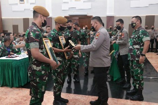 Kapolda Metro Jaya Irjen Pol. Dr. Moh Fadil Imran, M.Si. memberikan Piagam Penghargaan kepada 2 Prajurit TNI Yonarhanud 10/ABC yang berhasil menangkap Begal di Kebayoran Baru Jakarta Selatan pada tanggal 7 Mei 2022 lalu.