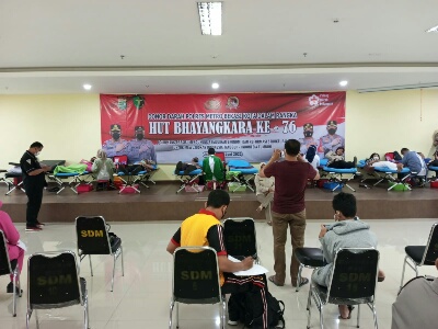 Para personil Polres Metro Bekasi Kota mendonorkan darahnya. Selain anggota polri, para PNS juga ikut serta dalam kegiatan itu.