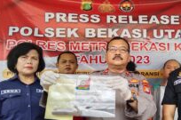 Kapolsek Bekasi Utara Kompol Arwan. A, ,M.M.yang didampingi Kasie Humas Polres Bekasi Kota Kompol Erna Ruswing Andari dan Kanit Reskrim Polsek Bekasi Utara Iptu Saputra saat konfrensi pres bersama awak media di Polsek Bekasi Utara,Rabu (02/08/2023)