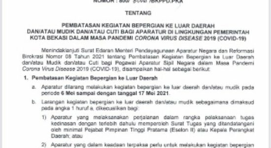 Bekasi – Aparatur Sipil Negara dilarang bepergian ke luar daerah/mudik menjelang dan